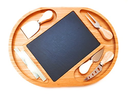 Landeluxe Bamboo Cheese Board and Cutlery Set with Slate.Perfect Platter,Serving Tray with Knives Set,Space for Crackers,Fruits,Charcuterie.Best Gift for Housewarming,Wedding.Bonus-2 Soapstone Chalks