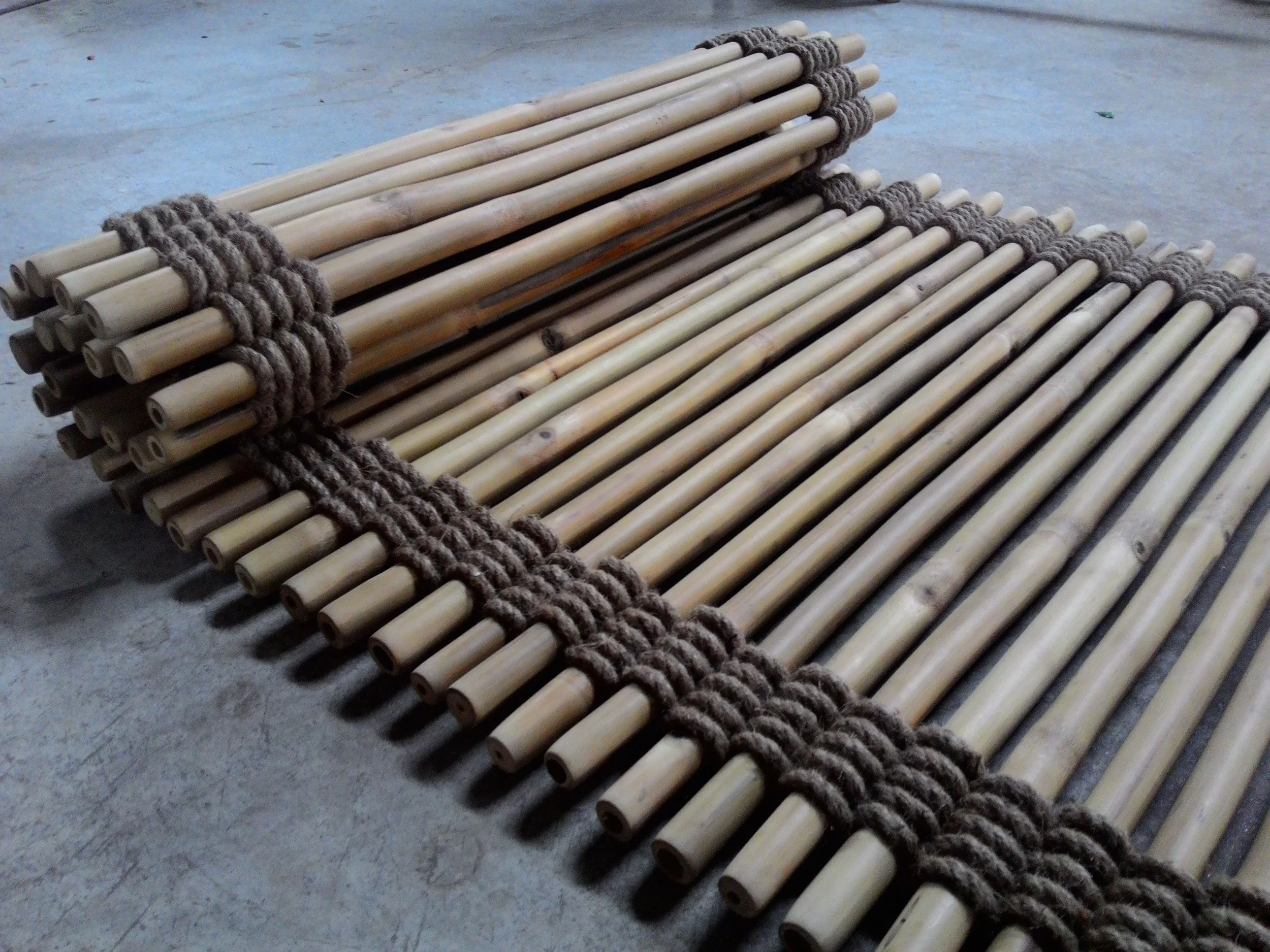 The Gemini Lounge™ has two personalities. Its an outdoor lounge that also transforms into a roll-up beach lounge. Carry case included. We are working on the frame for the outdoor lounge. The beach lounge, as seen here, would slide into the bamboo frame which can be left at home. This is the first prototype and has not yet been sealed with linseed oil. It is weaved with High Grade Manila Hemp Rope from the Philippines.